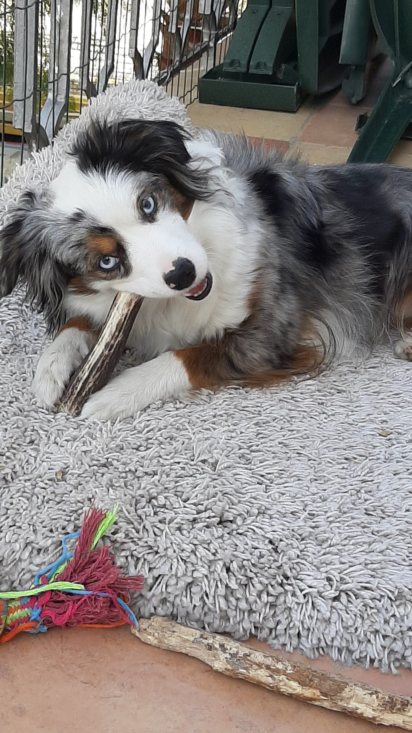 Je suis ravie du petit chiot de cet élevage. Il a bien été socialisé. Il est bien dans ses pattes, pas stressé par les nouveaux bruits que les chiens n’apprécient pas en général. il a confiance en moi à chaque fois que je lui propose une nouvelle expérience. Il connaissait bien le « non «  et « assis » et le rappel «  avec une séquence sonore particulière » il est déjà obéissant et semble très vif et intelligent il a de grands moments de calme et de câlins.